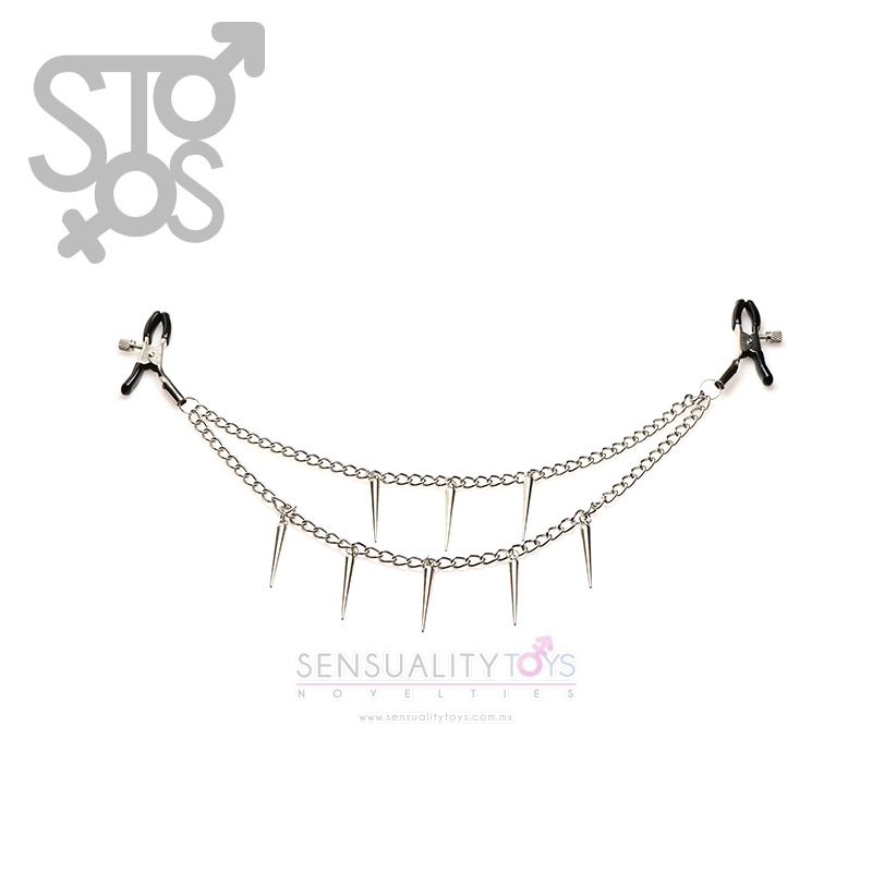 ‘-PLACER, DOLOR Y ATRACTIVO ESTÉTICO, TODO EN UNO: ESTAS ABRAZADERAS PARA LOS PEZONES SON LA MANERA PERFECTA DE ADORNARSE Y DAR UN TOQUE EXTRA PERVERTIDO A UN JUGUETE CLÁSICO. LA CADENA DE METAL TIENE PÚAS QUE CUELGAN DE CADENAS DOBLES.