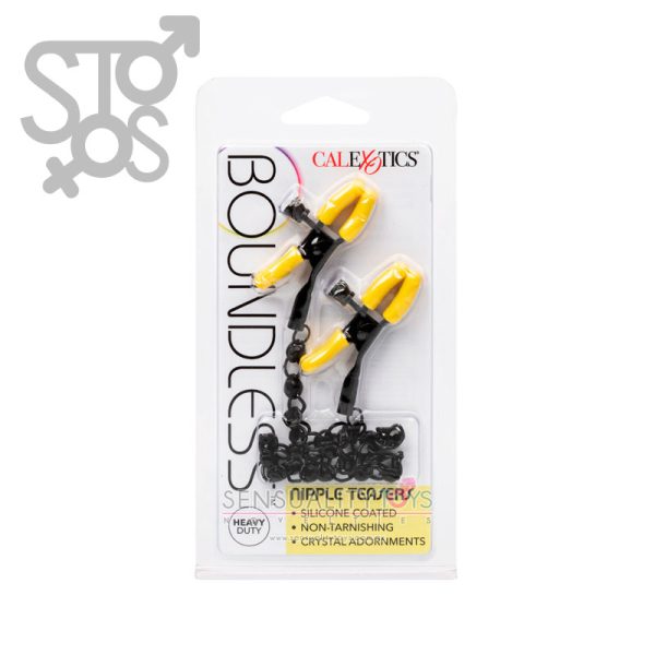 Empújese hacia el placer infinito y abrace la excitante estimulación de los Nipple Teasers Boundless™. Explore la sensación elevada con las 2 pinzas para pezones totalmente ajustables, la cadena sensual y los cristales brillantes.