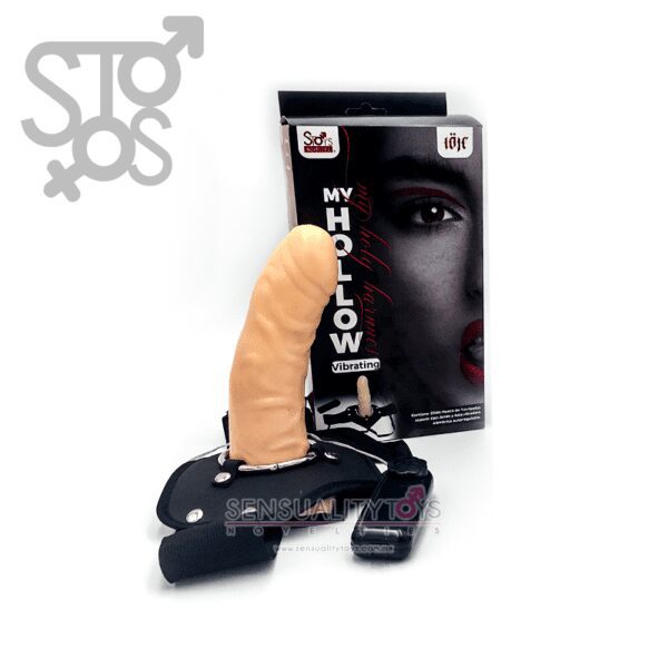 My Hollow Harness Vibrating incorpora un dildo hueco, fabricado con el novedoso material PVC. El arnés se compone de dos tiras anchas y regulables que permiten adaptarse a cada persona.